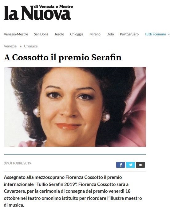 Vai al sito del quotidiano La Nuova Venezia… Navigazione articoli Il Premio Serafin alla Cossotto – La Voce di Rovigo Cavarzere: a Fiorenza Cossotto il premio Internazionale Tullio Serafin – LaPiazzaWeb.it