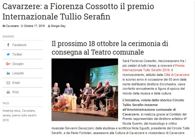 Vai al servizio del sito LaPiazzaWeb.it… Navigazione articoli A Cossotto il Premio Serafin – La Nuova Venezia QUESTA SERA A CAVARZERE LA CONSEGNA DEL PREMIO TULLIO SERAFIN ALLA MEZZOSOPRANO FIORENZA COSSOTTO – CavarzereAzzurra.it